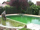 (Für eine Großansicht bitte in die Bilder klicken) Wenige Tage nach der Befüllung des Schwimmteiches mit Leitungswasser bekam das Wasser zunächste eine leichte Grünfärbung. Das ist in der Einfahrphase ganz normal, denn die Biologie im Filter benötigt einige Zeit um sich aufzubauen. Und im Trinkwasser sind sehr viele Nährstoffe die erst abgebaut werden müssen. Nach acht bis zwölf Wochen klart der Teich auf und das Wasser bleibt dauerhaft klar. Zum Baden ist das Wasser jedoch schon ab der Befüllung geeignet. Der Schwimmteich ist genauso wie der Naturpool ein natürliches Gewässer, das jahreszeitlichen Schwankungen unterliegt und auf Nährstoffeintrag mit vorübergehender Algenbildung reagieren kann. Wir empfehlen deshalb, den Poolroboter wöchentlich einzusetzen. So werden Beläge auf der Folie auf ein Minimum reduziert und Ablagerungen am Boden sofort wieder entfernt. Das ist die effektivste Methode, den Teich sehr sauber und kristallklar zu halten.